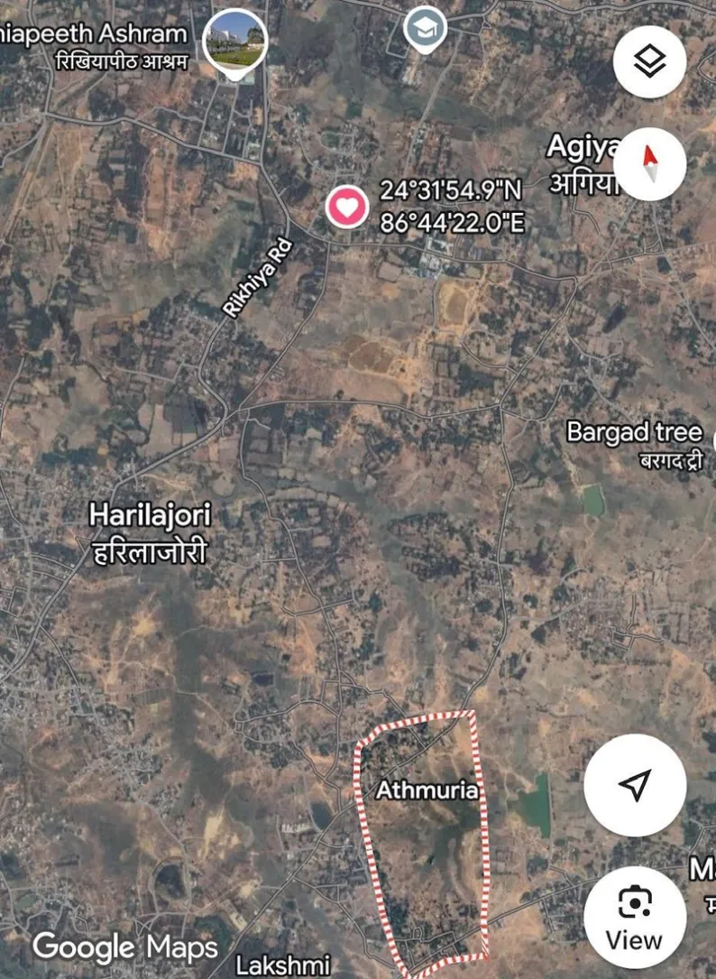 A google map view of the church land (the heart), The ashram, and the small village Athmuria (1.8miles)